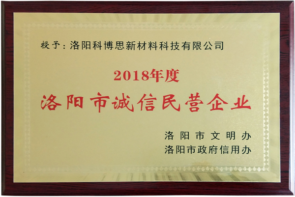 近日,由市文明辦與市政府信用辦舉辦的《洛陽市2018年度“誠信經(jīng)營企業(yè)”和“誠信建設(shè)先進(jìn)個(gè)人”評選活動》,經(jīng)推薦遴選和嚴(yán)格評審,洛陽科博思新材料科技有限公司被授予“誠信民營企業(yè)”榮譽(yù)稱號。