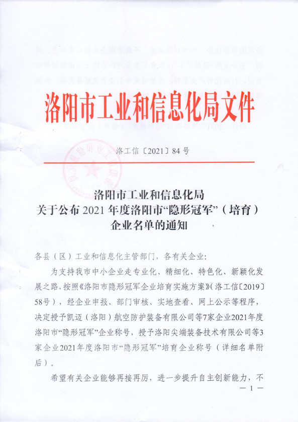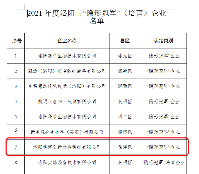 近日,洛陽市工業(yè)和信息化局印發(fā)了《關于公布2021年度洛陽市“隱形冠軍”(培育)企業(yè)名單的通知》(【2021】84號),洛陽科博思新材料科技有限公司榮獲“隱形冠軍”企業(yè)稱號。